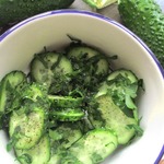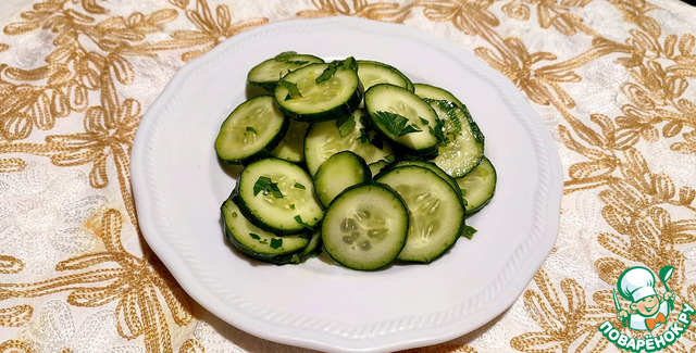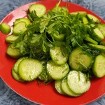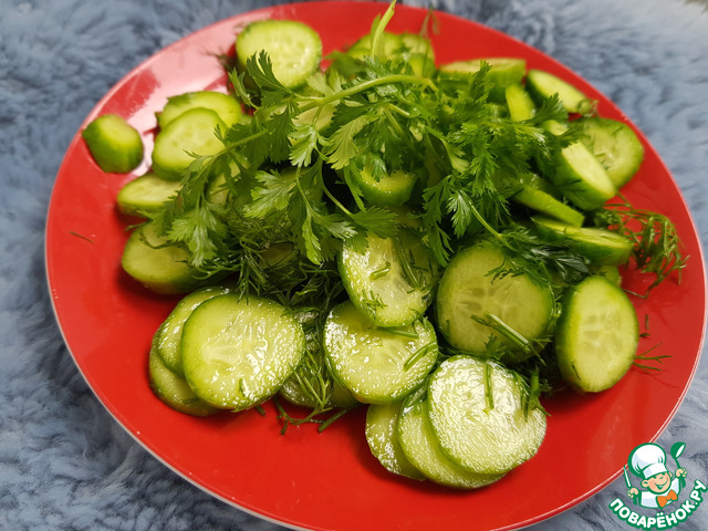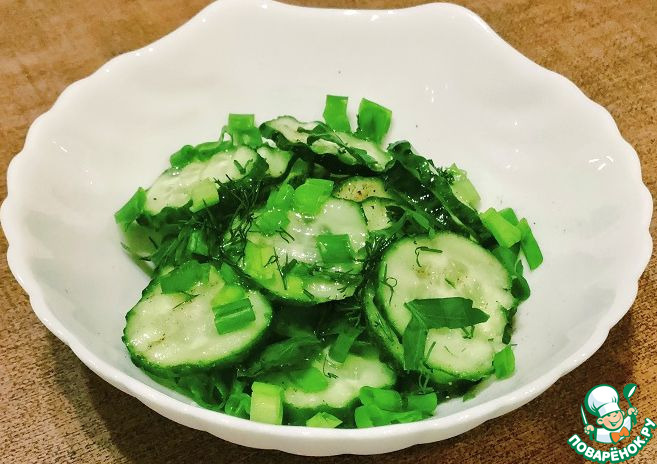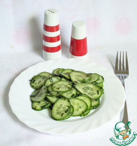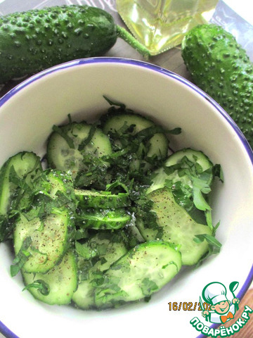 Нарезаете тонко огурцы (у меня есть специальная машинка, так на ней огурцы за секунду нарезаются) складываете их в салатницу, мелко шикуете зелень (лук, петрушка, базилик) тоже отправляете следом за огурцами в салатницу, добавляете чуточку уксуса, солите, маслицем заправляете и готово!
