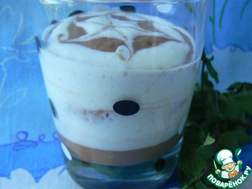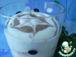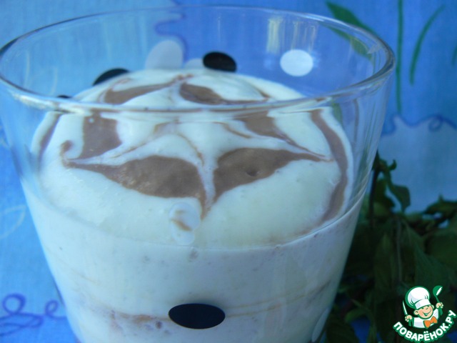 Далее возможны два варианты подачи. Для первого в стакан одновременно вливаем белый и темный смузи. Далее можно сверху сделать узор с помощью зубочистки