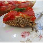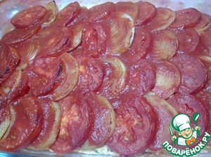 Помидоры и лук нарезать кружочками. После того как фарш охладится, выложить верхний слой из помидоров и репчатого лука по очереди. Отправить блюдо запекаться. Выпекать ленивые котлеты при температуре 180 градусов 20 минут.