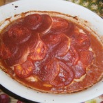 Тем временем приготовить заливку. Томатную пасту развести водой, посолить. По истечении 20 минут достать форму из духовки, залить запеканку томатным соком и далее запекать до румяной корочки, пока жидкость вся не испарится.