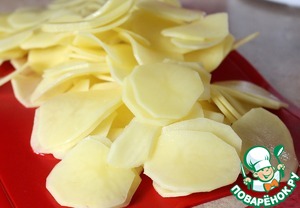 Картофель почистить и нарезать тонкими кружочками (лучше всего теркой мандолиной). Чем тоньше Вы нарежете, тем быстрее блюдо приготовится.