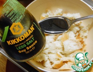 Ставим духовку на разогрев на 190-200 градусов. Батон крошим, заливаем молоком и соевым соусом.