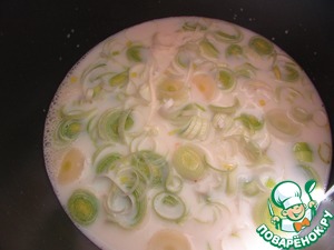 Добавить лук-порей, нарезанный тоненькими кружочками, оставив немного для украшения.