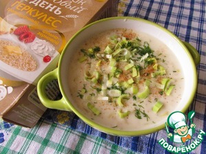 Мы очень любим кашу, печенье, хлеб из геркулеса, а также кисель из него. Поэтому, когда впервые увидела этот рецепт, то отнеслась к нему с большим интересом, и не зря... Суп получился необычным, но в то же время очень полезным и вкусным, став в нашей семье одним из любимых. Насыщенный вкус этому супу придаёт наличие обжаренных лука и геркулеса, а также добавление куриного бульона, молока и лука-порея