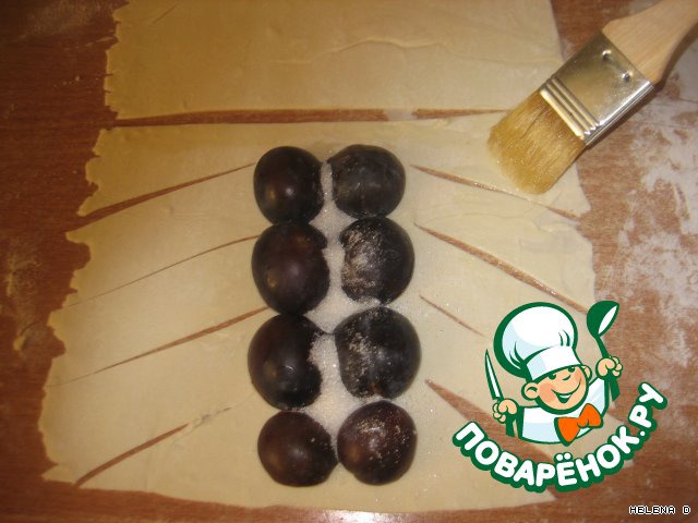 Уложить и посыпать сахаром сливы, обмазать яичным белком тесто.