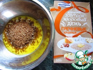 • Всыпать гречневый хлопья ТМ"Мистраль", перемешать и оставить на 7 минут