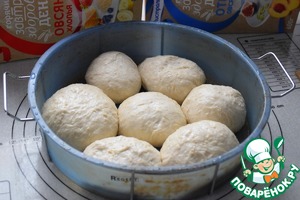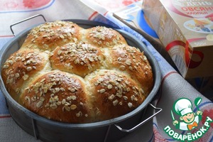 Накрываем форму пакетом и убираем в теплое место на 35 мин. для подъема. Затем смазываем булочки взбитым яйцом и посыпаем овсяными хлопьями.