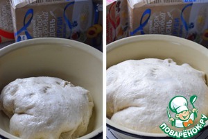Выкладываем тесто в смазанную растительным маслом чашку, перебиваем тесто, накрываем пленкой или пакетом и убираем в теплое место для расстойки на 30-40 мин.