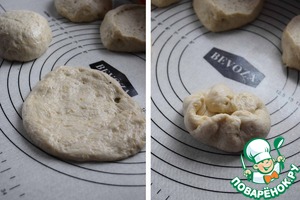 Раскатываем (я растягивала руками) каждый кусочек теста в тонкую лепешку (если тесто прилипает к рукам - смажьте руки растительным маслом), поднимаем края и собираем в серединку.