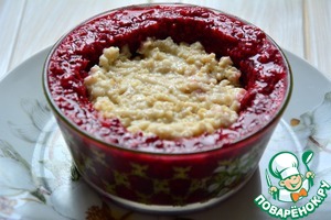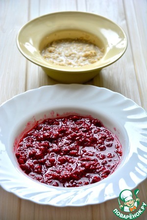 Желатин распустить и разделить на 2 части. Половину вылить в малину, вторую часть добавить в кашу. Размешать