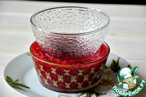 Малину вылить в чашку или формочку небольшого размера, так чтобы она доходила до середины чашки. Сверху в малину поставить другую чашку, так чтобы получилась выемка. Убрать в холодильник до застывания.