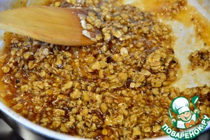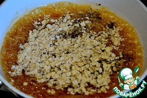 Далее делаем овсяный грильяж. Сахар нужно растопить до карамельного цвета