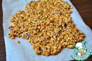 Бумагу для выпечки смазываем растительным маслом и на нее тонким слоем выкладываем сладкую массу. Даем ей остыть (можно поместить в холод). Готовое мороженое посыпаем овсяным грильяжем и подаем. Приятного аппетита!