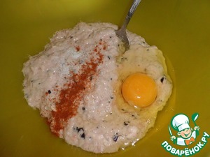 • Добавить соль, перец и яйцо, тщательно перемешать.
