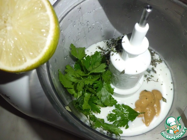 • Тем временем смешиваем все ингредиенты для соуса:кефир, сок лайма (лимона), мяту, петрушку, горчицу.