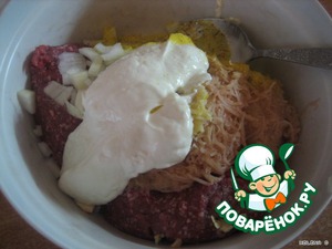 Натереть картофель на мелкой тёрке, добавить сметану, выдавить зубец чеснока, добавить приправу к фаршу.