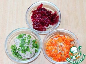 добавить мелко порубленный зеленый лук, тертую на крупной терке свеклу, мелко порезанный перец (корейская морковь по желанию) и отдельно в каждой чашке перемешать.