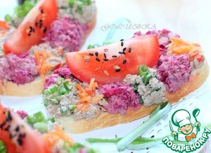 Обжарить ломтики хлеба и выложить вилкой, чередуя по цвету рыбную смесь. Украсить бутерброд ломтиком помидора и перьями зеленого лука.
