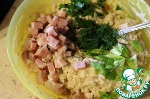 К полученной массе добавить мелко рубленную зелень, зеленый лук и ветчину нарезанную кубиками.
