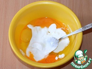 Яйца немного взбить, смешать с 3 ст. ложками сметаны.