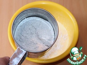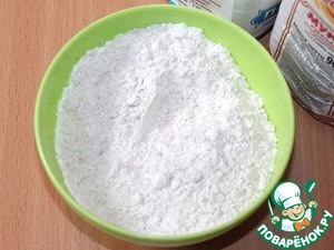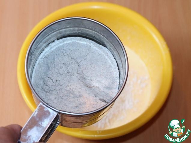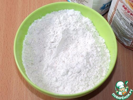 Муку пшеничную смешать с ржаной мукой, с разрыхлителем теста,