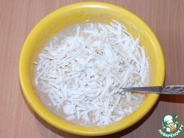 Добавить в мучную смесь натертые на крупной терке кабачок и сыр. Твердый сыр можно заменить на колбасный.