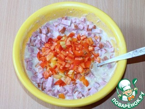 Нарезать небольшими кубиками сладкий перец и ветчину, зелень и чеснок измельчить. Всё смешать.
