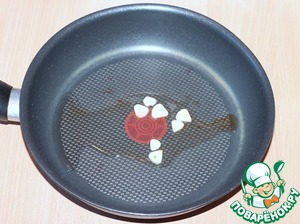 К кексу я приготовила соус. Чеснок (1 зуб.) нарезать и обжарить на оливковом масле (2 ст. л.). Затем чеснок удаляем, а чесночное масло оставляем.