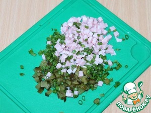 Ветчину, огурцы (лучше свежий салатный огурец) нарезать на маленькие кубики, зеленый лук мелко порубить. Добавляем нарезанное к начинке и перемешиваем.