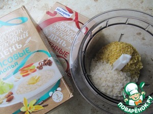 Измельчить в блендере рисовые и пшенные хлопья, добавив к ним сахарную пудру. Если измельчить хлопья крупно, то в коржах будут ощущаться вкрапления хлопьев, поэтому степень помола выбирайте по своему вкусу (у меня мелкий помол).