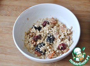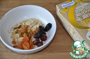 Добавляем сухофрукты к овсяным хлопьям, наливаем воду.