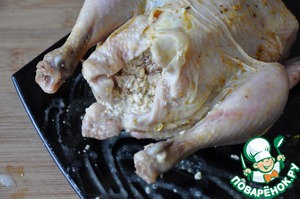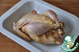 Кладём курицу в форму для запекания, зубочистками скрепляем отверстие.
