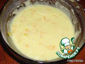 Яйца перетереть с сахаром, влить майонез, погашенную соду, тщательно перемещать. Добавить смесь из крахмала и муки. Тщательно вымешать.