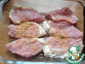 Мясо нарезать порционными небольшими стейками. Добавить специи.