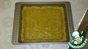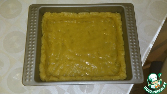 6. Берем емкость для выпекания, смазываем растительным маслом дно и края по бокам, выкладываем тесто, разминая руками по дну, делаем обязательно бортики.