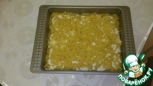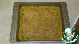 9. Достаем из морозилки кусочек теста и натираем его на крупной терке. Потом посыпаем пирог сверху. Нужно, чтобы максимально закрылись яйца.