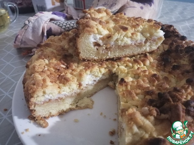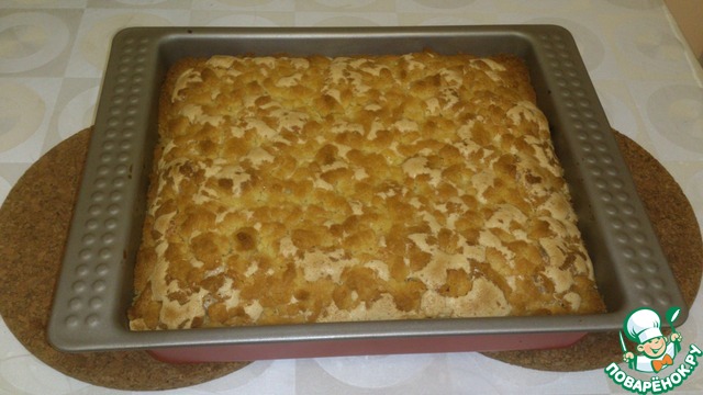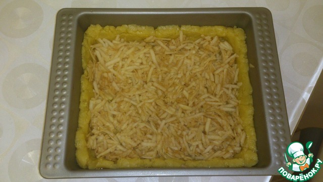 7. Сверху выкладываем натертые яблоки. Я их немного отжала руками, чтобы сок лишний вышел, иначе получится очень мокрая выпечка.