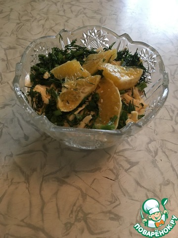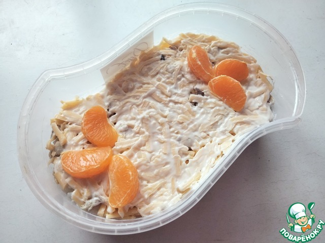 На салатницу выкладываем часть риса, смазываем его майонезом, после кладем дольки апельсина, можно целиком, а можно дольки разделить пополам. Снова майонез, дальше куриное филе и майонез, итак повторяем. Получается 2 слоя, 2-3 дольки оставляем на украшение верха салата. Последний штрих - дольки апельсина и посыпаем тертым сыром. Ставим в холодильник на 3-4 часа.