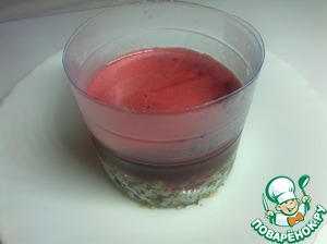 Затем вылить вишнево-молочную смесь в кольцо на утрамбованную основу. Дать десерту застыть, поставить в холодильник на один час.