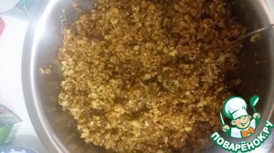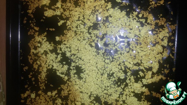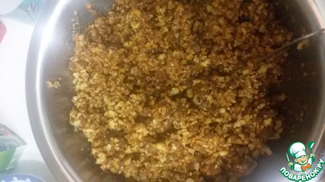 Готовую крошку, изюм, грецкие орехи выложить в тазик и смешать со сгущенным молоком.