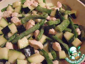 Кабачок нарезать кубиками, вместе со стручковой фасолью добавить к курице, тушить на среднем огне под крышкой 10 минут.