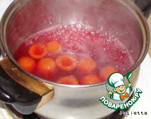 Перед окончанием варки желе, необходимо добавить в него свежие или консервированные вишню, черешню, малину или клубнику. У меня были консервированные абрикосы.