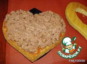 Вырезанную часть (маленькое сердце) порезать мелкими кубиками, частично раскрошить.