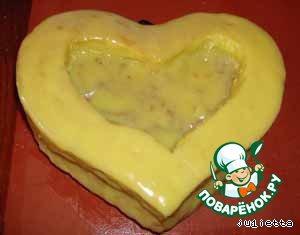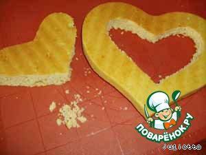 У одного из коржей отступая от края 4 см. вырезать по контуру сердце (если делаете торт из одного коржа, его следует разрезать пополам и вырезать маленькое сердечко из одной из половин).