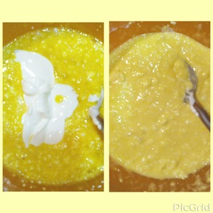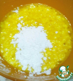 Яйца перемешать с сахаром или сгущенкой. Если хотите воздушное суфле, то лучше взбить белки с сахаром (или с щепоткой соли/лим. кислоты - если делаете со сгущенкой) отдельно, а к желткам все добавлять и в конце - белковую пену. (Честно скажу, спала моя мама, и, чтобы её не будить, я не пользовалась блендером. Поэтому у меня не поднимется суфле, а вам все равно советую взбить белки)