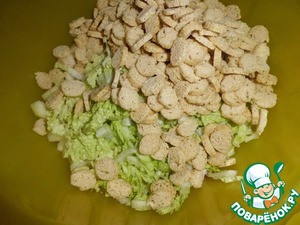 Добавляем в салат капусту и сухарики (возможно использование домашних).