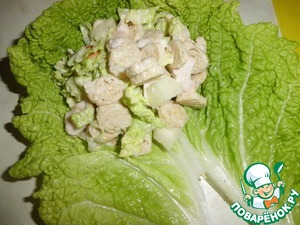 Отбираем верхние крупные листья. Остальную капусту разрезаем пополам и мелко шинкуем её зеленую, мягкую часть (вторая половина нам не потребуется, её можно будет использовать в какой-нибудь другой салат).