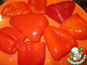 4)перцы мою,кладу в духовку,желательно на решётку.Включаю духовку(у меня электрическая)на 180 градусов и готовлю их там до того момента,пока кожица не сморщится.Потом вынимаю и кладу в пакет.Завязываю этот пакет.И перцы там лежат минут 10.Потом вынимаю перцы ,беру за плодоножку и снимаю кожицу,она сходит чулком с них.Только аккуратно надо,потому что сок из перцев горячий может потечь.