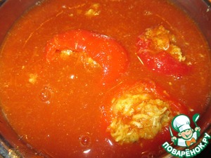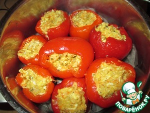 Наполнить перцы начинкой. Выложить в подходящую по объёму кастрюлю.