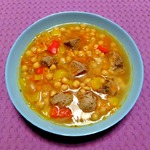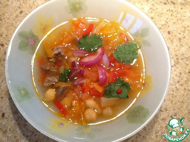 5. Готовое мясо вынуть, отделить от костей и вернуть в кастрюлю. В кастрюлю с мясом добавить нут, болгарский перец и варить 2-3 минуты